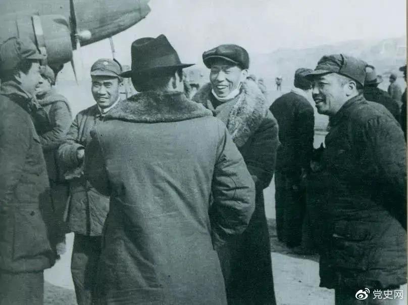 1946年2月19日,毛泽东等在延安机场迎接从重庆回延安汇报工作的周恩来。