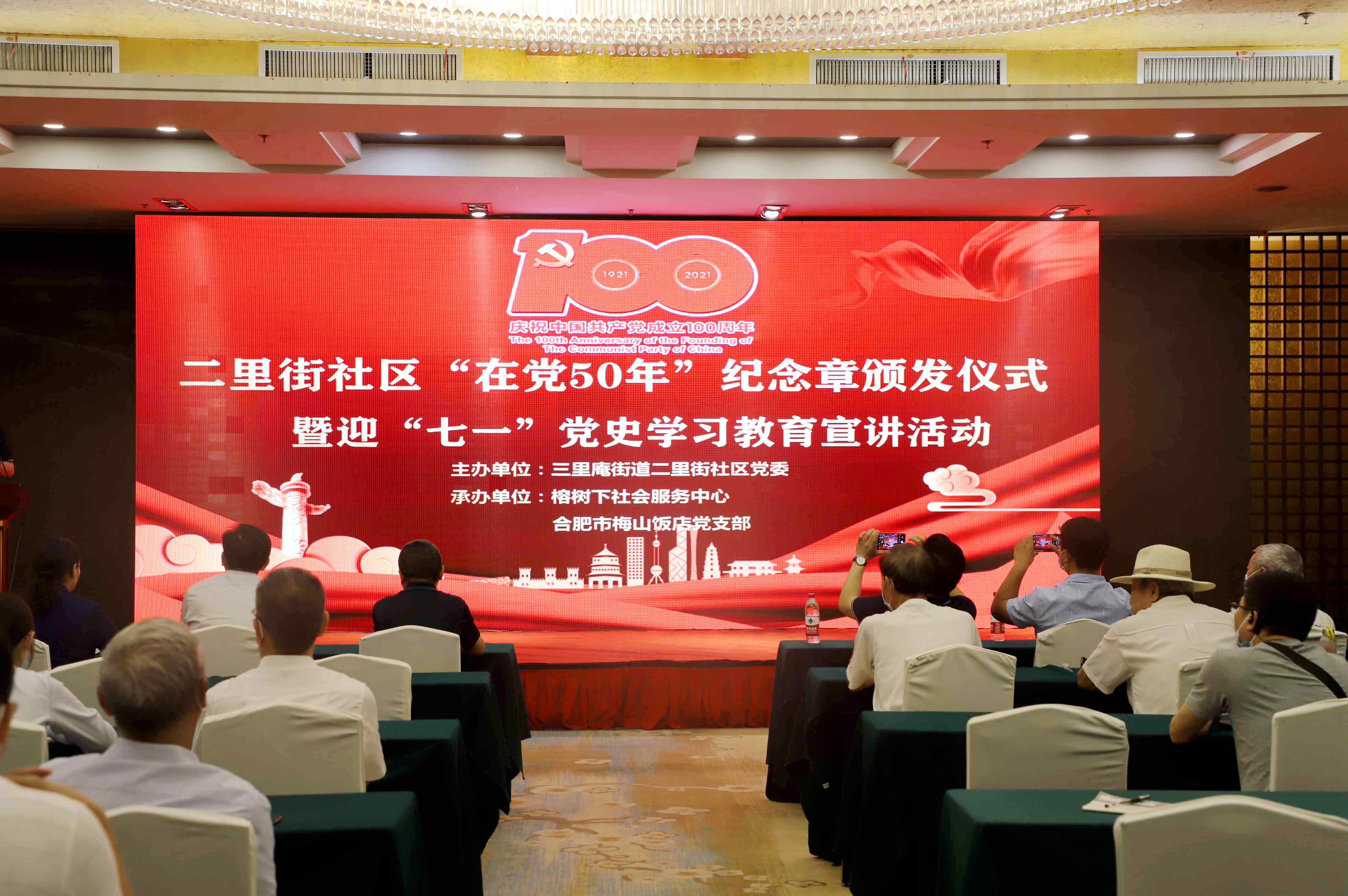 为深入贯彻落实习近平总书记在党史学习教育动员大会上的讲话精神,持续推动党史学习教育走深走实,推进基层党建工作扎实开展。6月22日上午,梅山饭店党支部与二里街社区党委共同组织开展“在党50周年”纪念章颁发仪式暨迎“七一”党组织书记讲党课联学共建活动。蜀山区委党史学习教育宣讲团成员、三里庵街道党工委委员孟霞,二里街社区党委书记付康康,梅山饭店党支部书记、董事长娄俊作为参会嘉宾出席活动。三里庵街道其他班子成员、党员代表,梅山饭店党支部代表等90余人参会。