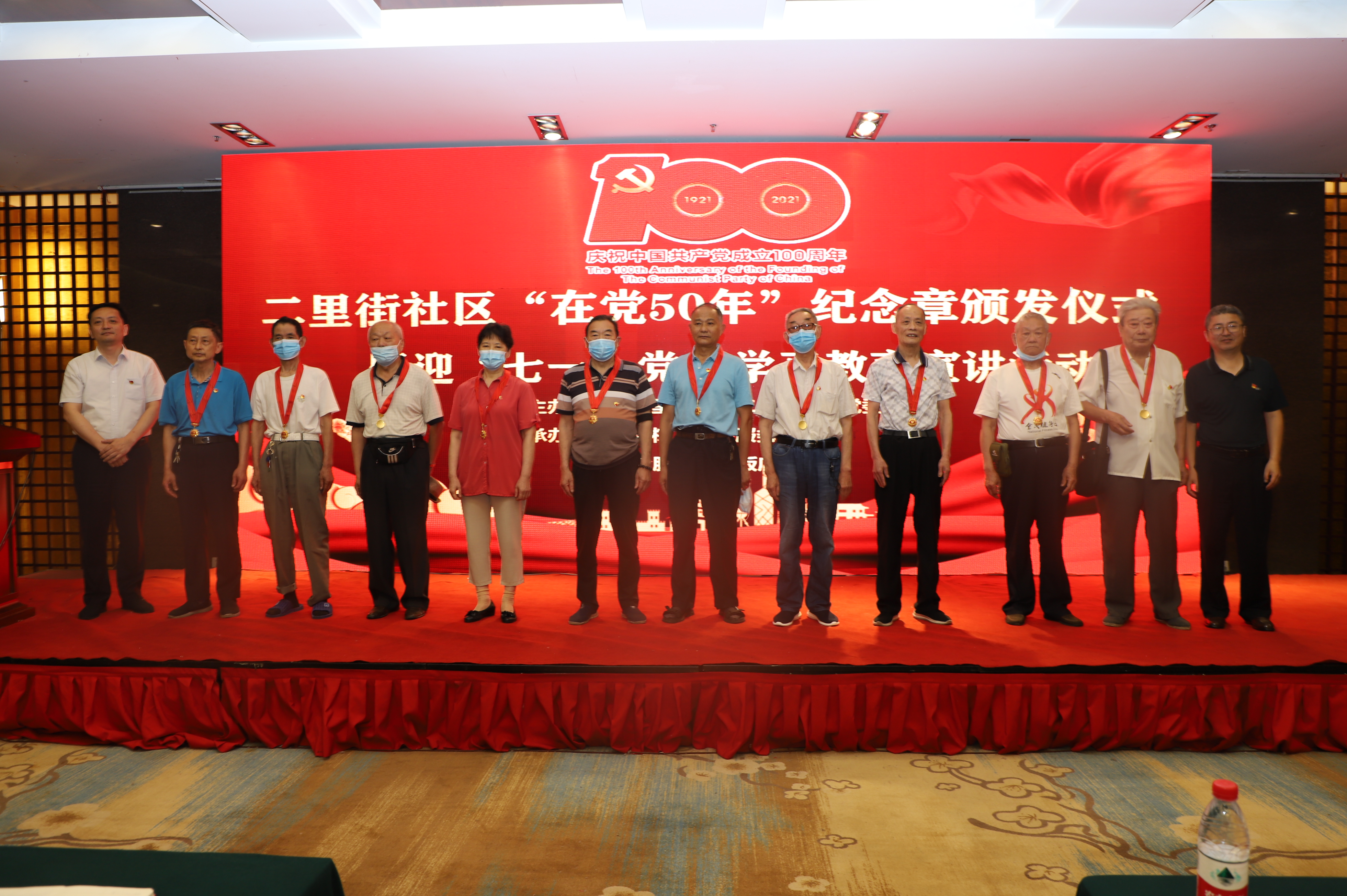 随后,颁奖仪式在庄严的国际歌声中拉开序幕。十位党龄满50年的优秀党员代表胸前佩戴党徽精神抖擞,付康康、娄俊向这些老党员们颁发并佩戴纪念章,鲜红的缎带、闪亮的纪念章,与白发交相辉映,仿佛老去的只有岁月,不变的终是信仰。这是对社区广大老党员精神风貌和重要作用的充分肯定,也是对老党员持续传承模范精神的关怀和嘉奖。最后,孟霞主讲了以《回望百年风雨路 砥砺奋进新征程》为主题的党课,带领大家一同接受党性洗礼,筑牢信仰之基,为建党100周年献礼。