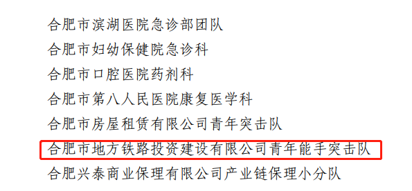 “青年文明号”是以青年为主体,在生产、经营、管理和服务中创建的体现高度职业文明、创造一流工作成绩的青年集体、青年岗位和青年工程。近日,从合肥市创建青年文明号活动组委会传来喜讯,合肥市地方铁路投资建设有限公司青年能手突击队(以下简称:合肥地方铁路青年能手突击队),以优异的表现荣获2020年度“合肥市青年文明号”称号。